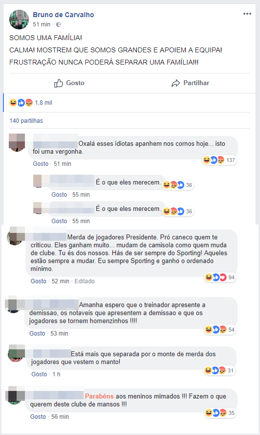 Bruno de Carvalho faz post a apelar à “calma da família”, adeptos dizem que jogadores “deviam apanhar”!