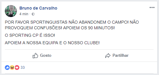 Perante o que se está a passar no Jamor com o Sporting a levar um treino, Bruno não resistiu e foi fazer mais um post na sua rede social favorita, desta feita dedicado aos adeptos que começaram a abandonar o estádio após o 2º golo do CD Aves.